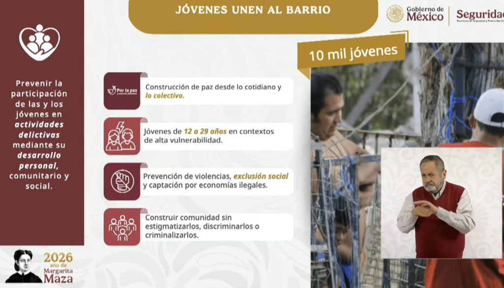 Por su parte, Beatriz Adriana Olivares Pinal, titular del Centro Nacional de Prevención del Delito y Participación Ciudadana del SESNSP, presentó el programa “Las y los Jóvenes Unen al Barrio”, para prevenir la participación de las y los jóvenes en actividades delictivas mediante su desarrollo personal, comunitario y social. Con el cual se busca la construcción de paz desde lo cotidiano y lo colectivo, destinado a jóvenes de 12 a 29 años en contextos de alta vulnerabilidad. Se prevendrán violencias, exclusión social y captación por economías ilegales y se construirá comunidad sin estigmatizarlos, discriminarlos o criminalizarlos.