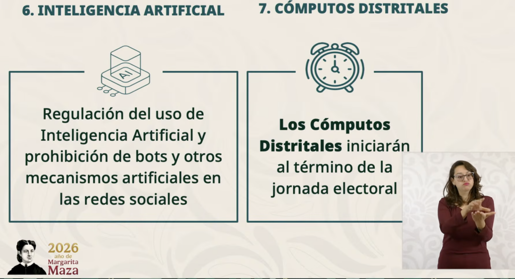 Se propone regular el uso de la Inteligencia Artificial en procesos electorales y prohibir estrictamente el uso de bots y mecanismos artificiales en redes sociales. Además, se plantea que los Cómputos Distritales inicien inmediatamente al término de la jornada electoral para dar certeza más pronto.
