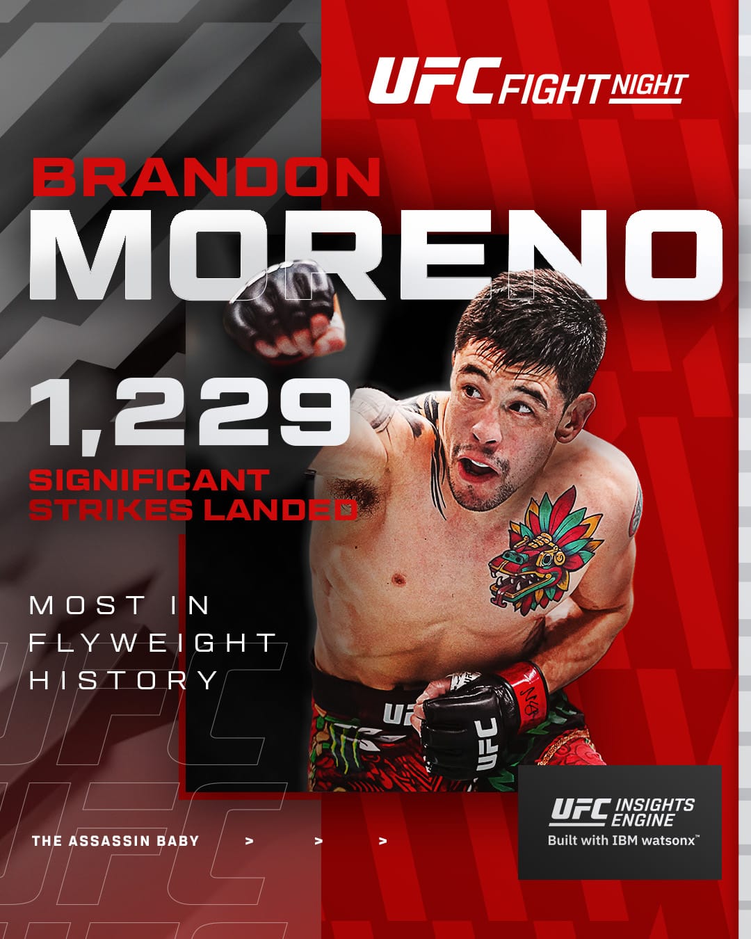 Moreno se encuentra en el sexto lugar de la división de peso mosca, luego de perder en diciembre pasado contra Tatsuro Taira. El artemarcialista apodado “Bebé Asesino” llega con 23 peleas ganadas, nueve perdidas y dos empates.